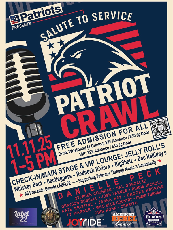 The Veterans Day Patriot Crawl supports Label 22, a nonprofit founded by veterans and artists to empower military service members through music, mentorship, and community connection.